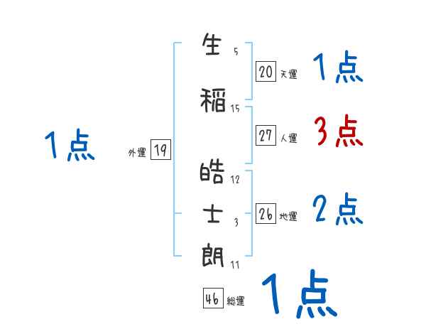 総運![]() | 生稲皓士朗さんの総運は46画の1つ星!迷走することが多く苦労するかも。目先のことにとらわれないように。 あなたの人生を表す1番重要な運勢です。生涯を通じて影響する総合運となり、主に50歳以降の晩年期に影響を及ぼします。 |