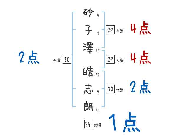 天運![]() | 砂子澤皓志朗さんの天運は29画の4つ星!完全主義で才能がある。厳格な心の持ち主。 家系が持つ宿命的な運勢を表します。祖先から受け継いだ苗字ですので自分の力が及びません。家柄を象徴します。 |