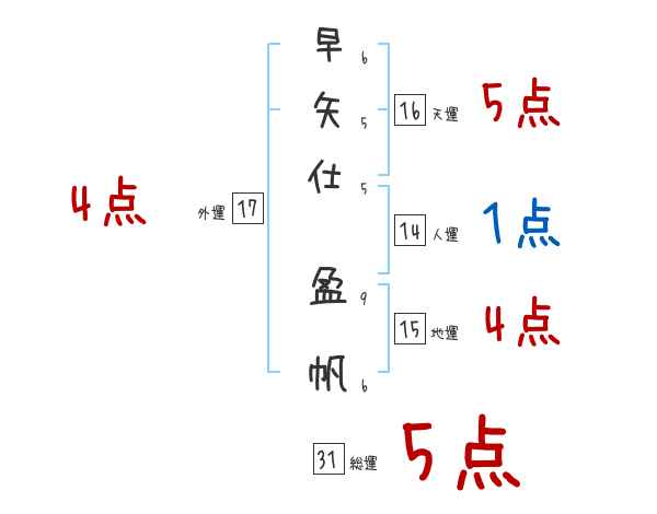 地運![]() | 早矢仕盈帆さんの地運は15画の4つ星!人徳があり出世する。順調に物事を進め円満な人生。 個性を表す基礎的な運勢です。性格形成や対人関係、行動力など家庭環境に影響されます。主に誕生してから20歳くらいまでの若年期の運勢を表します。 |