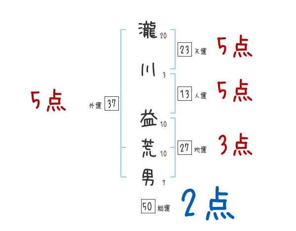 天運![]() | 瀧川益荒男さんの天運は23画の5つ星!想像力に優れ活力がある。一代で成功し名誉を手に入れる。 家系が持つ宿命的な運勢を表します。祖先から受け継いだ苗字ですので自分の力が及びません。家柄を象徴します。 |