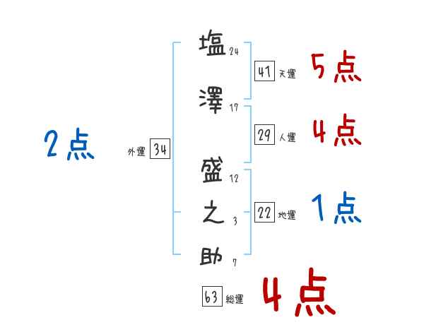 総運![]() | 塩澤盛之助さんの総運は63画の4つ星!家庭運がよく順調な生活。温和な性格。 あなたの人生を表す1番重要な運勢です。生涯を通じて影響する総合運となり、主に50歳以降の晩年期に影響を及ぼします。 |