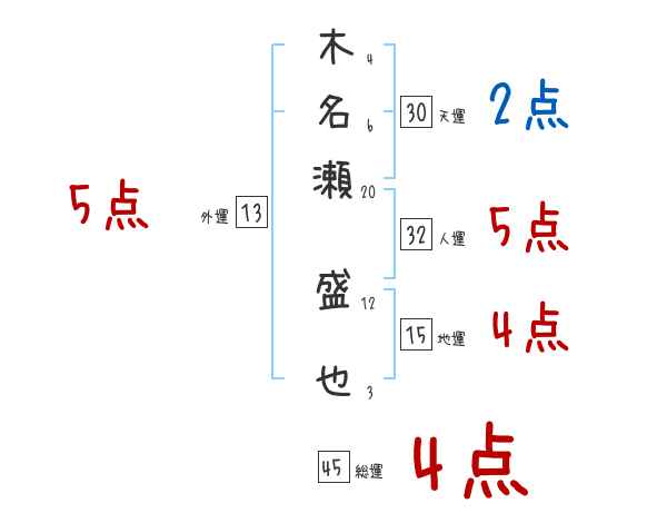 総運![]() | 木名瀬盛也さんの総運は45画の4つ星!もくもくと物事を進め達成する。地味な努力家。 あなたの人生を表す1番重要な運勢です。生涯を通じて影響する総合運となり、主に50歳以降の晩年期に影響を及ぼします。 |