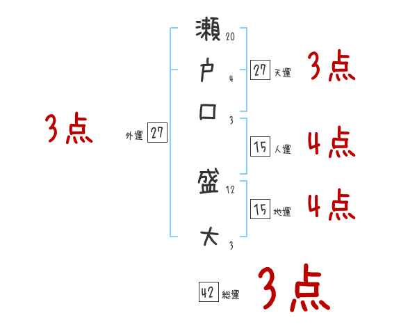 天運![]() | 瀬戸口盛大さんの天運は27画の3つ星!頭脳明晰だが強情で摩擦が多い傾向。孤立に注意。 家系が持つ宿命的な運勢を表します。祖先から受け継いだ苗字ですので自分の力が及びません。家柄を象徴します。 |