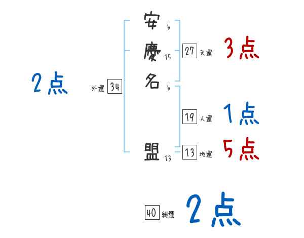地運![]() | 安慶名盟さんの地運は13画の5つ星!才能に恵まれ人気がある。名声を手に入れる。円満な人生。 個性を表す基礎的な運勢です。性格形成や対人関係、行動力など家庭環境に影響されます。主に誕生してから20歳くらいまでの若年期の運勢を表します。 |