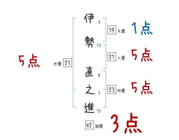 地運![]() | 伊勢直之進さんの地運は23画の5つ星!想像力に優れ活力がある。一代で成功し名誉を手に入れる。 個性を表す基礎的な運勢です。性格形成や対人関係、行動力など家庭環境に影響されます。主に誕生してから20歳くらいまでの若年期の運勢を表します。 |