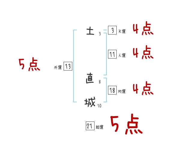 天運![]() | 土直城さんの天運は3画の4つ星!活動的で才能に恵まれ、多くの信頼を得る。希望に満ち成長する。 家系が持つ宿命的な運勢を表します。祖先から受け継いだ苗字ですので自分の力が及びません。家柄を象徴します。 |