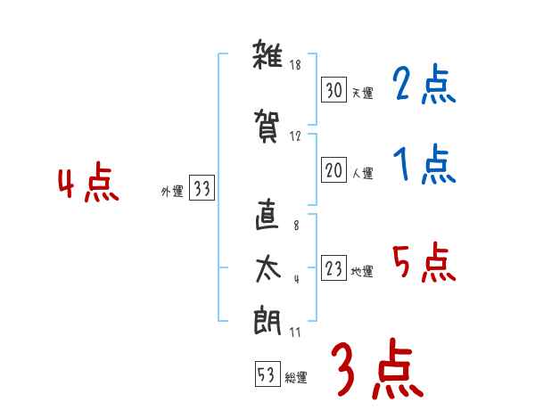 外運![]() | 雑賀直太朗さんの外運は33画の4つ星!権力志向でプライドが高い。勇気があり運を切り開き成功する。 生活面を象徴する運勢です。外部から受ける影響力を表し、結婚運、家庭運や職場、環境への順応性を表します。 |