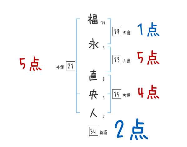 外運![]() | 福永直央人さんの外運は21画の5つ星!統率力がある。独立し成功する。名誉を手に入れる。 生活面を象徴する運勢です。外部から受ける影響力を表し、結婚運、家庭運や職場、環境への順応性を表します。 |