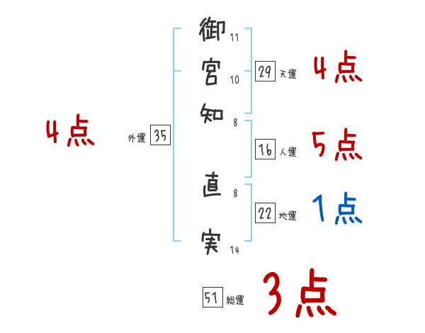 外運![]() | 御宮知直実さんの外運は35画の4つ星!温厚な性格で感受性が高い。穏和な性格で人望が厚い。 生活面を象徴する運勢です。外部から受ける影響力を表し、結婚運、家庭運や職場、環境への順応性を表します。 |