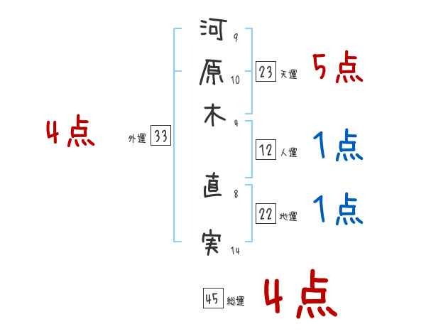 天運![]() | 河原木直実さんの天運は23画の5つ星!想像力に優れ活力がある。一代で成功し名誉を手に入れる。 家系が持つ宿命的な運勢を表します。祖先から受け継いだ苗字ですので自分の力が及びません。家柄を象徴します。 |
