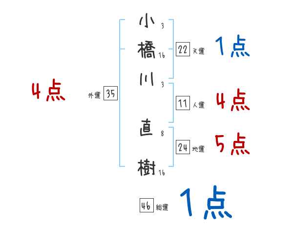外運![]() | 小橋川直樹さんの外運は35画の4つ星!温厚な性格で感受性が高い。穏和な性格で人望が厚い。 生活面を象徴する運勢です。外部から受ける影響力を表し、結婚運、家庭運や職場、環境への順応性を表します。 |