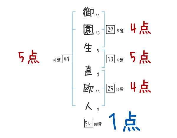 総運![]() | 御園生直欧人さんの総運は54画の1つ星!トラブルが多いかも。周りをよく見て協調して過ごしましょう。 あなたの人生を表す1番重要な運勢です。生涯を通じて影響する総合運となり、主に50歳以降の晩年期に影響を及ぼします。 |
