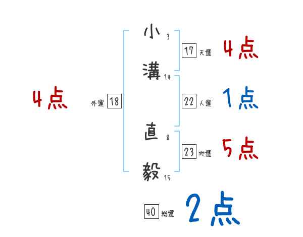 地運![]() | 小溝直毅さんの地運は23画の5つ星!想像力に優れ活力がある。一代で成功し名誉を手に入れる。 個性を表す基礎的な運勢です。性格形成や対人関係、行動力など家庭環境に影響されます。主に誕生してから20歳くらいまでの若年期の運勢を表します。 |