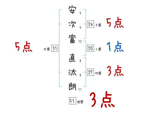 総運![]() | 安次富直汰朗さんの総運は51画の3つ星!変化が激しく、危険に注意。堅実な性格。 あなたの人生を表す1番重要な運勢です。生涯を通じて影響する総合運となり、主に50歳以降の晩年期に影響を及ぼします。 |