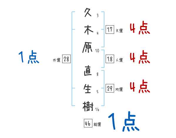 外運![]() | 久木原直生樹さんの外運は28画の1つ星!家庭環境に注意。スポーツで活躍できる能力があるかも。 生活面を象徴する運勢です。外部から受ける影響力を表し、結婚運、家庭運や職場、環境への順応性を表します。 |