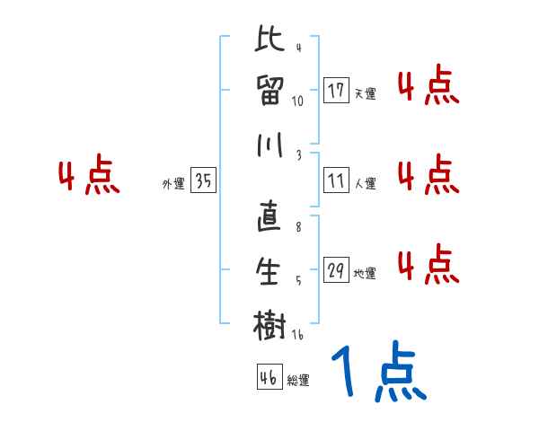 外運![]() | 比留川直生樹さんの外運は35画の4つ星!温厚な性格で感受性が高い。穏和な性格で人望が厚い。 生活面を象徴する運勢です。外部から受ける影響力を表し、結婚運、家庭運や職場、環境への順応性を表します。 |