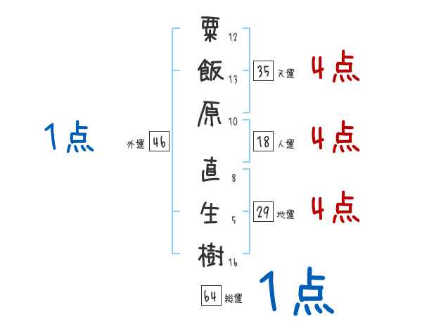 人運![]() | 粟飯原直生樹さんの人運は18画の4つ星!情熱的で剛気。忍耐力があり信頼される。 性格や才能などを表す2番目に重要な運勢です。人間関係や協調性、社会的な成功に影響します。主に20歳から50歳ぐらいまでの中年期の運勢を表します。 |