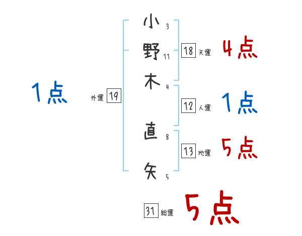 天運![]() | 小野木直矢さんの天運は18画の4つ星!情熱的で剛気。忍耐力があり信頼される。 家系が持つ宿命的な運勢を表します。祖先から受け継いだ苗字ですので自分の力が及びません。家柄を象徴します。 |