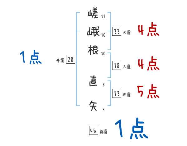 天運![]() | 嵯峨根直矢さんの天運は33画の4つ星!権力志向でプライドが高い。勇気があり運を切り開き成功する。 家系が持つ宿命的な運勢を表します。祖先から受け継いだ苗字ですので自分の力が及びません。家柄を象徴します。 |