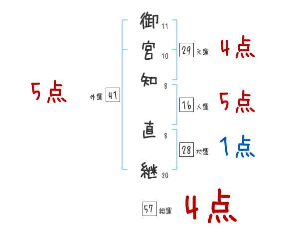 人運![]() | 御宮知直継さんの人運は16画の5つ星!人望が厚く大きく発展する。逆転成功が見える。 性格や才能などを表す2番目に重要な運勢です。人間関係や協調性、社会的な成功に影響します。主に20歳から50歳ぐらいまでの中年期の運勢を表します。 |
