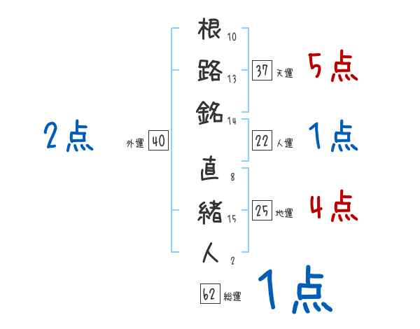 地運![]() | 根路銘直緒人さんの地運は25画の4つ星!個性があり才能があふれる。強運の持ち主で発展する。 個性を表す基礎的な運勢です。性格形成や対人関係、行動力など家庭環境に影響されます。主に誕生してから20歳くらいまでの若年期の運勢を表します。 |