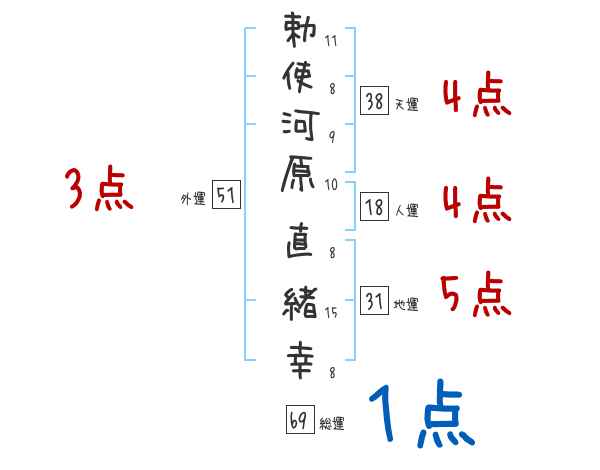 人運![]() | 勅使河原直緒幸さんの人運は18画の4つ星!情熱的で剛気。忍耐力があり信頼される。 性格や才能などを表す2番目に重要な運勢です。人間関係や協調性、社会的な成功に影響します。主に20歳から50歳ぐらいまでの中年期の運勢を表します。 |