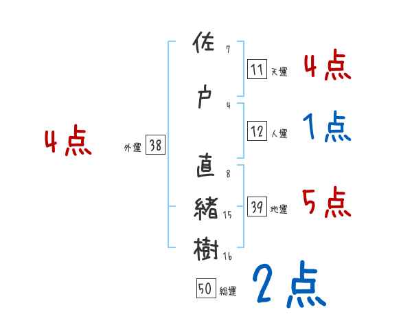 天運![]() | 佐戸直緒樹さんの天運は11画の4つ星!着実に富や地位を得る幸運な人生。 家系が持つ宿命的な運勢を表します。祖先から受け継いだ苗字ですので自分の力が及びません。家柄を象徴します。 |