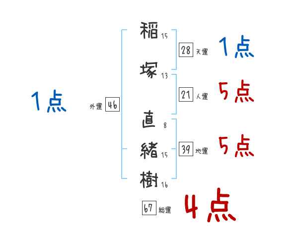 地運![]() | 稲塚直緒樹さんの地運は39画の5つ星!社交性に優れ人望が厚い。人の上に立ち成功する。 個性を表す基礎的な運勢です。性格形成や対人関係、行動力など家庭環境に影響されます。主に誕生してから20歳くらいまでの若年期の運勢を表します。 |