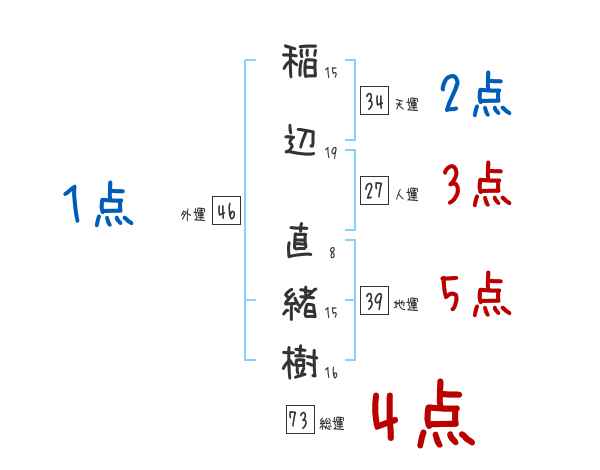 総運![]() | 稲辺直緒樹さんの総運は73画の4つ星!天徳のある人生。散財に注意すれば晩年幸福。 あなたの人生を表す1番重要な運勢です。生涯を通じて影響する総合運となり、主に50歳以降の晩年期に影響を及ぼします。 |