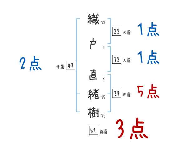 天運![]() | 織戸直緒樹さんの天運は22画の1つ星!努力することが苦手ないっぽう手先が器用。芸術性にも優れる。 家系が持つ宿命的な運勢を表します。祖先から受け継いだ苗字ですので自分の力が及びません。家柄を象徴します。 |