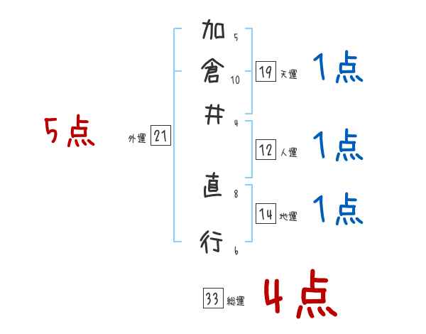 天運![]() | 加倉井直行さんの天運は19画の1つ星!優れた才能を持ちますが、協調性が足りないことも。周りの人と協力する事を意識しましょう。 家系が持つ宿命的な運勢を表します。祖先から受け継いだ苗字ですので自分の力が及びません。家柄を象徴します。 |