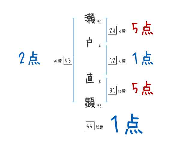 天運![]() | 瀬戸直顕さんの天運は24画の5つ星!家庭運が良く順調な人生。金運にも恵まれる。 家系が持つ宿命的な運勢を表します。祖先から受け継いだ苗字ですので自分の力が及びません。家柄を象徴します。 |
