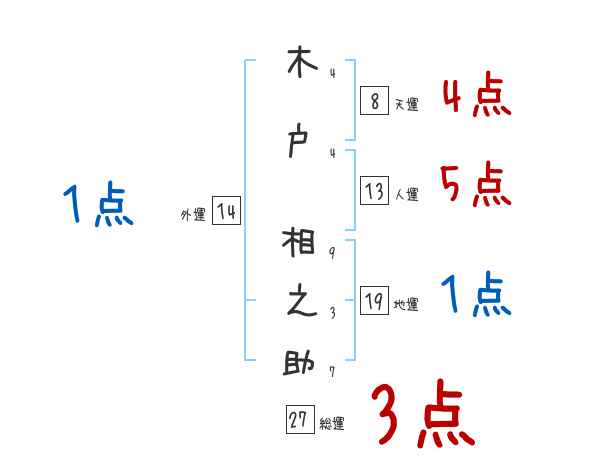 外運![]() | 木戸相之助さんの外運は14画の1つ星!人に対して優しいがストレスを溜め込みがち。人間関係のトラブルを避けるよう気をつけましょう。 生活面を象徴する運勢です。外部から受ける影響力を表し、結婚運、家庭運や職場、環境への順応性を表します。 |