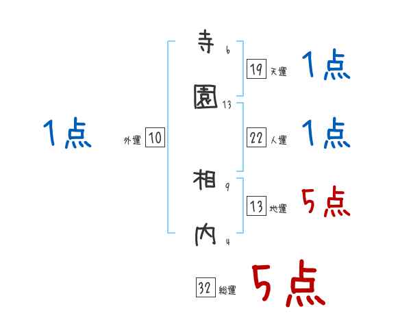 総運![]() | 寺園相内さんの総運は32画の5つ星!柔軟性があり成功する。チャンスが多く金運が良い。 あなたの人生を表す1番重要な運勢です。生涯を通じて影響する総合運となり、主に50歳以降の晩年期に影響を及ぼします。 |
