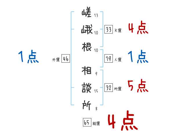 天運![]() | 嵯峨根相談所さんの天運は33画の4つ星!権力志向でプライドが高い。勇気があり運を切り開き成功する。 家系が持つ宿命的な運勢を表します。祖先から受け継いだ苗字ですので自分の力が及びません。家柄を象徴します。 |
