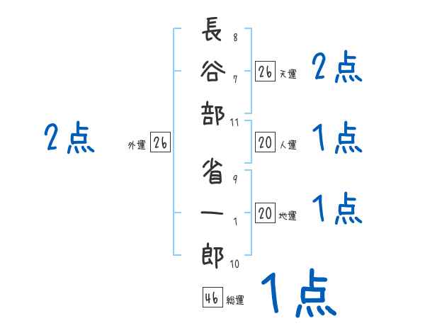 外運![]() | 長谷部省一郎さんの外運は26画の2つ星!波瀾万丈かも。信頼できる人を大事にしましょう。 生活面を象徴する運勢です。外部から受ける影響力を表し、結婚運、家庭運や職場、環境への順応性を表します。 |
