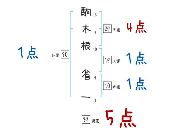 総運![]() | 駒木根省一さんの総運は39画の5つ星!社交性に優れ人望が厚い。人の上に立ち成功する。 あなたの人生を表す1番重要な運勢です。生涯を通じて影響する総合運となり、主に50歳以降の晩年期に影響を及ぼします。 |