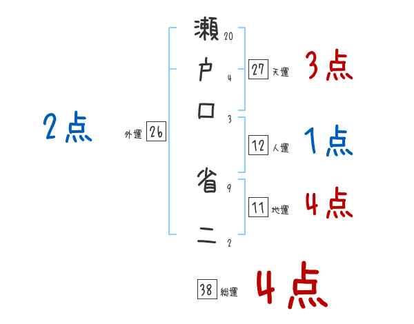 総運![]() | 瀬戸口省二さんの総運は38画の4つ星!温厚な性格で技術的な才能を発揮する。職人的な仕事に向いている。 あなたの人生を表す1番重要な運勢です。生涯を通じて影響する総合運となり、主に50歳以降の晩年期に影響を及ぼします。 |