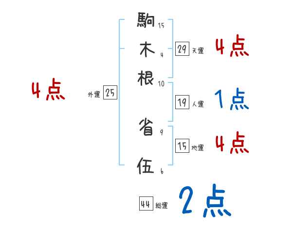 総運![]() | 駒木根省伍さんの総運は44画の2つ星!誠実で慎重な性格。物事を考えすぎないように注意しましょう。 あなたの人生を表す1番重要な運勢です。生涯を通じて影響する総合運となり、主に50歳以降の晩年期に影響を及ぼします。 |