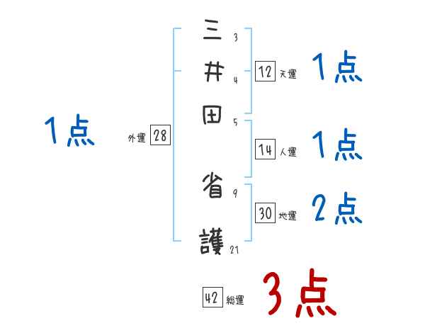 外運![]() | 三井田省護さんの外運は28画の1つ星!家庭環境に注意。スポーツで活躍できる能力があるかも。 生活面を象徴する運勢です。外部から受ける影響力を表し、結婚運、家庭運や職場、環境への順応性を表します。 |
