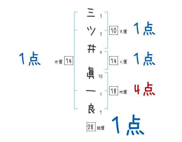 総運![]() | 三ツ井眞一良さんの総運は28画の1つ星!家庭環境に注意。スポーツで活躍できる能力があるかも。 あなたの人生を表す1番重要な運勢です。生涯を通じて影響する総合運となり、主に50歳以降の晩年期に影響を及ぼします。 |