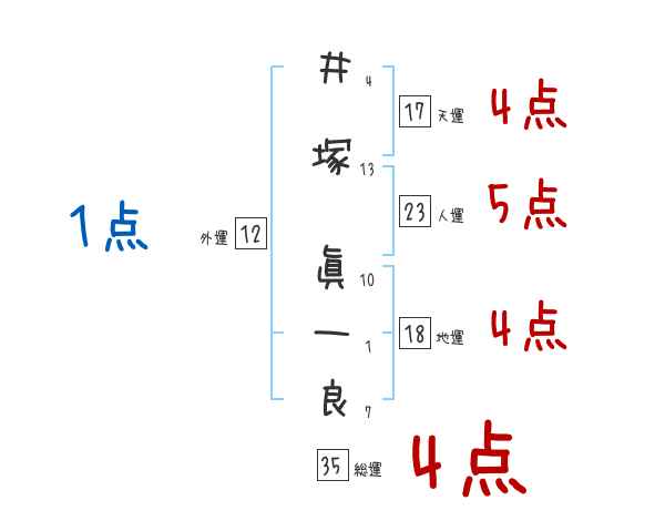 総運![]() | 井塚眞一良さんの総運は35画の4つ星!温厚な性格で感受性が高い。穏和な性格で人望が厚い。 あなたの人生を表す1番重要な運勢です。生涯を通じて影響する総合運となり、主に50歳以降の晩年期に影響を及ぼします。 |
