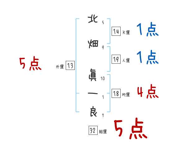 人運![]() | 北畑眞一良さんの人運は19画の1つ星!優れた才能を持ちますが、協調性が足りないことも。周りの人と協力する事を意識しましょう。 性格や才能などを表す2番目に重要な運勢です。人間関係や協調性、社会的な成功に影響します。主に20歳から50歳ぐらいまでの中年期の運勢を表します。 |