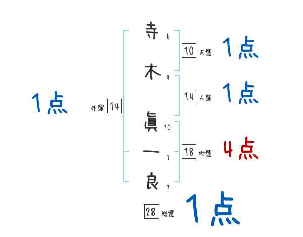 総運![]() | 寺木眞一良さんの総運は28画の1つ星!家庭環境に注意。スポーツで活躍できる能力があるかも。 あなたの人生を表す1番重要な運勢です。生涯を通じて影響する総合運となり、主に50歳以降の晩年期に影響を及ぼします。 |