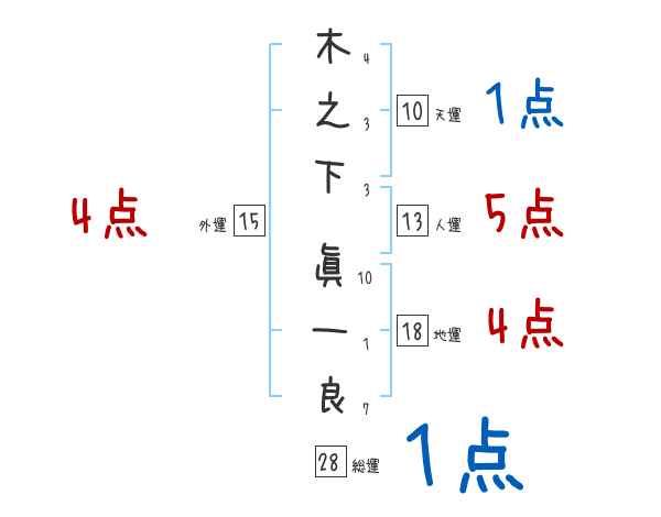 総運![]() | 木之下眞一良さんの総運は28画の1つ星!家庭環境に注意。スポーツで活躍できる能力があるかも。 あなたの人生を表す1番重要な運勢です。生涯を通じて影響する総合運となり、主に50歳以降の晩年期に影響を及ぼします。 |