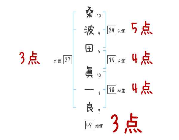 総運![]() | 桑波田眞一良さんの総運は42画の3つ星!病気に注意。多芸であるが消極的でおとなしい。 あなたの人生を表す1番重要な運勢です。生涯を通じて影響する総合運となり、主に50歳以降の晩年期に影響を及ぼします。 |