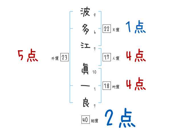 天運![]() | 波多江眞一良さんの天運は22画の1つ星!努力することが苦手ないっぽう手先が器用。芸術性にも優れる。 家系が持つ宿命的な運勢を表します。祖先から受け継いだ苗字ですので自分の力が及びません。家柄を象徴します。 |