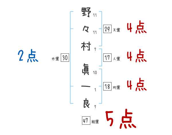 | 天運  | 野々村眞一良さんの天運は29画の4つ星!完全主義で才能がある。厳格な心の持ち主。家系が持つ宿命的な運勢を表します。祖先から受け継いだ苗字ですので自分の力が及びません。家柄を象徴します。 |