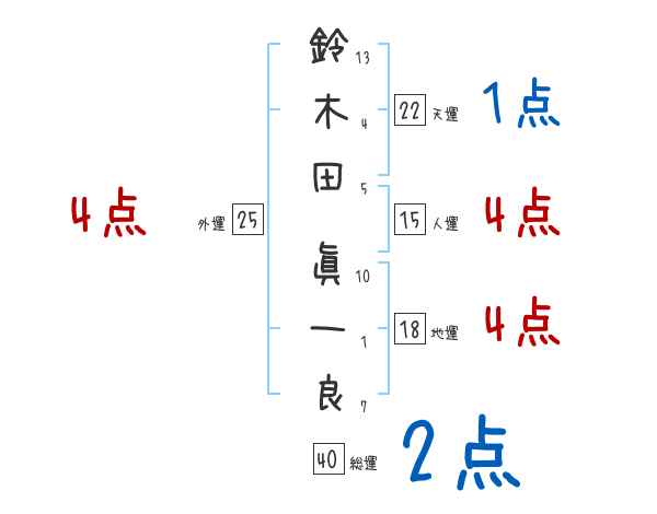 総運![]() | 鈴木田眞一良さんの総運は40画の2つ星!自信過剰で物事に固執するためトラブルに注意。 あなたの人生を表す1番重要な運勢です。生涯を通じて影響する総合運となり、主に50歳以降の晩年期に影響を及ぼします。 |