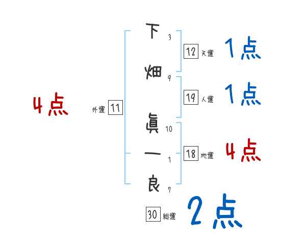天運![]() | 下畑眞一良さんの天運は12画の1つ星!簡単な失敗で諦めてしまいやすいかも。着実に行動すると良いでしょう。 家系が持つ宿命的な運勢を表します。祖先から受け継いだ苗字ですので自分の力が及びません。家柄を象徴します。 |